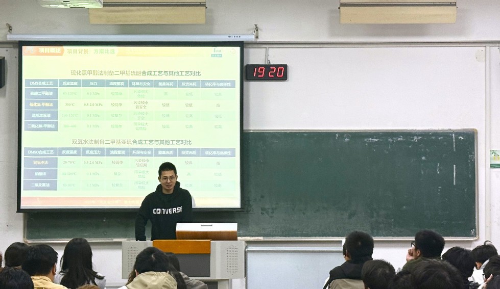 為幫助同學(xué)們拓寬專業(yè)視野、提升專業(yè)實(shí)踐能力,11月11日晚,“石化青年說”系列講座第二講在W1207教室順利舉行,講座由化工224班常佩源與化工226班張皓博兩位同學(xué)擔(dān)任主講。他們所在的常州大學(xué)“砜硫隊(duì)”,曾憑借“福建凱美特氣體有限公司分公司年產(chǎn)1.5萬噸二甲基亞砜項(xiàng)目”的出色設(shè)計(jì),在2025年“天正設(shè)計(jì)杯”第十九屆全國(guó)大學(xué)生化工設(shè)計(jì)競(jìng)賽中脫穎而出,斬獲全國(guó)特等獎(jiǎng)。